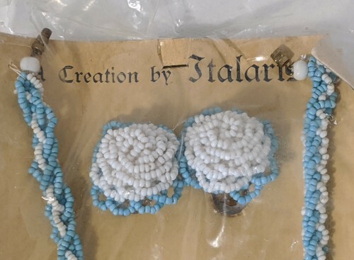 Up for sale is a new on card Midcentury Italarts Turquoise Seed Bead Braided Neckace Earring Set Italy