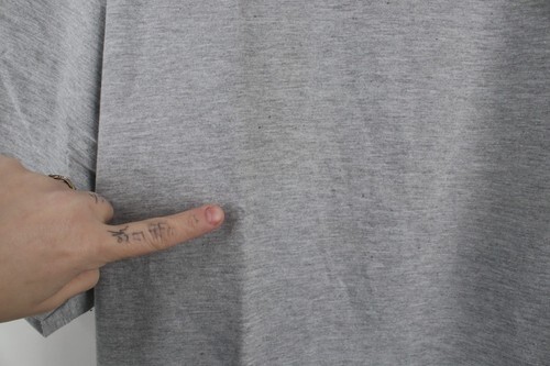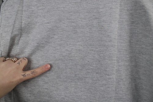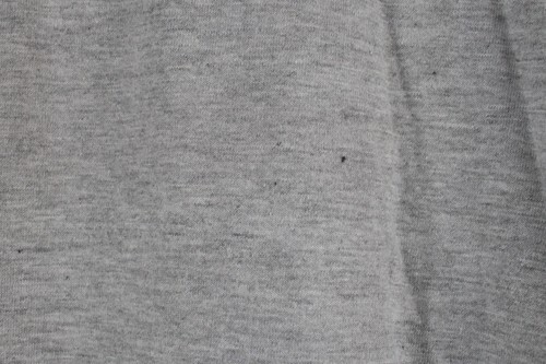 Dark spots/blemishes front, back. Collar, armpits discolored. Color faded. Pilling