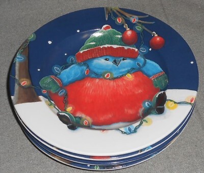 This is a set of (4) 8 1/4" Salad or Dessert Plates from Cypress Home that have a Christmas Penguin Pattern - each one is different. Great graphics and colors and all four are in good pre-owned condition with no chips or damage.