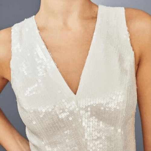 Glistening, icy sequins make an alluring statement on this sleeveless sheath, punctuated with a sheer tulle back.True to size.Back zip closureV-neckSleevelessGet the perfect Partially lined - 100% nylon - Dry clean - Imported - Dresses100% polyerster sequin with 100% nylon tulle/Lining Content: 100%Polyester