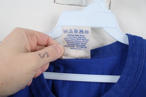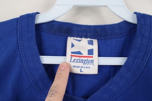 Blemishes front, back, collar. Discoloring throughout. Color faded. Pilling. Made in USA