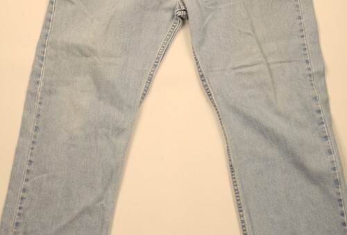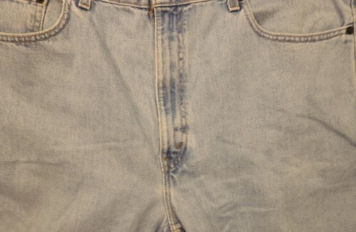 Discoloring, thread bare cuffs and fly. Distressed and faded. Color faded. Made in USA. Tagged waist 40 but measures and fits size 38