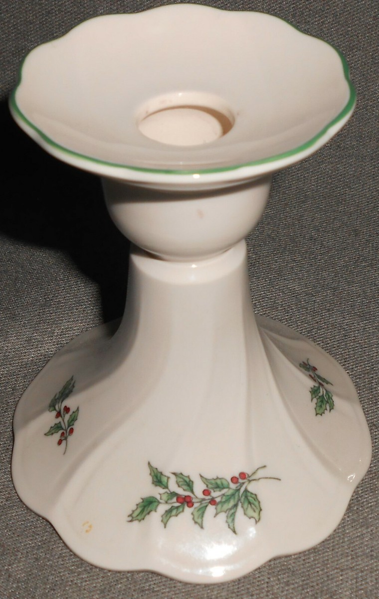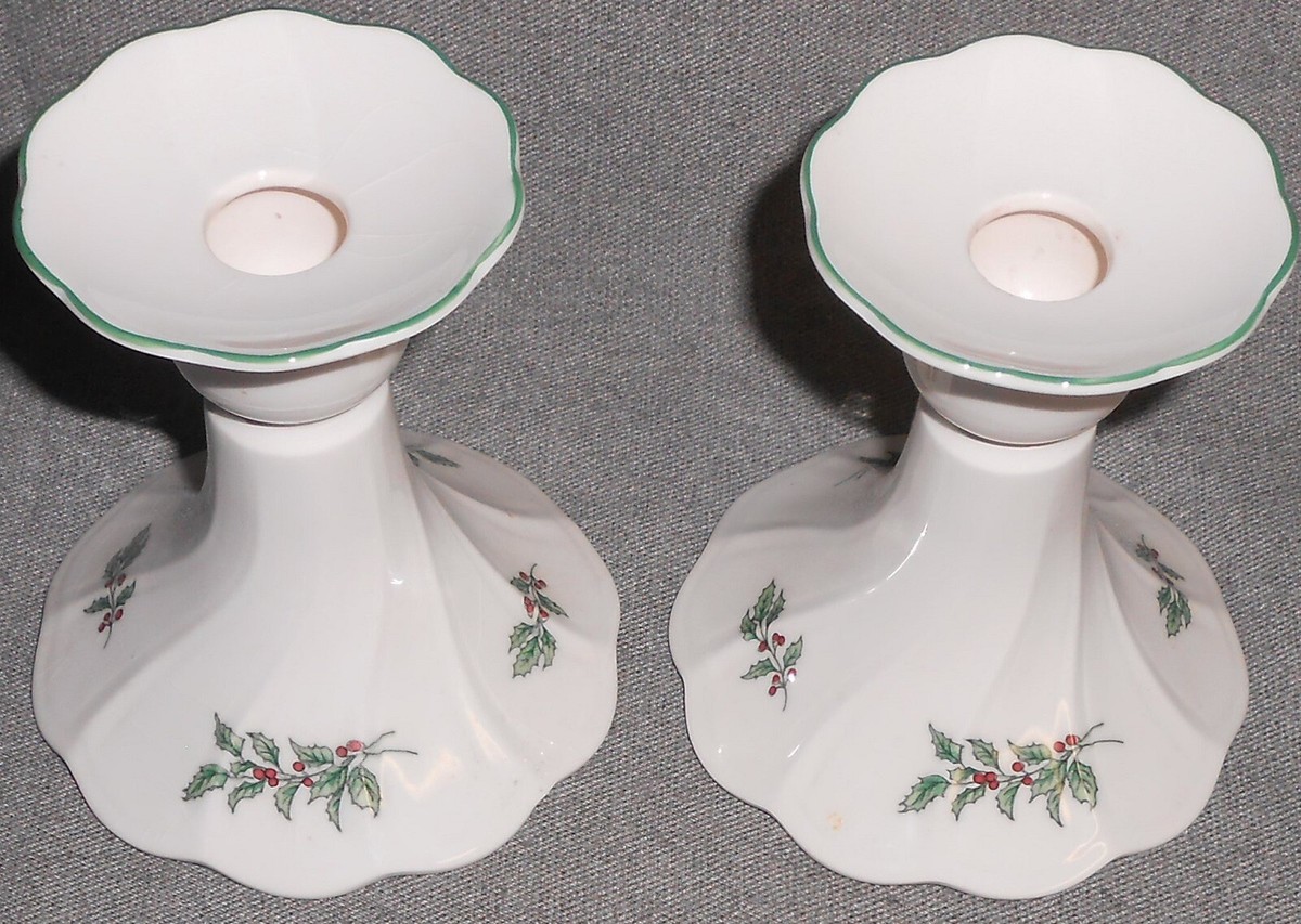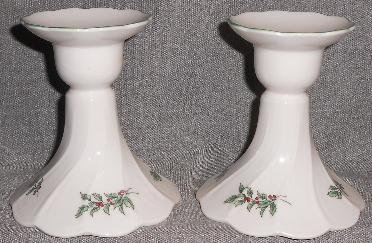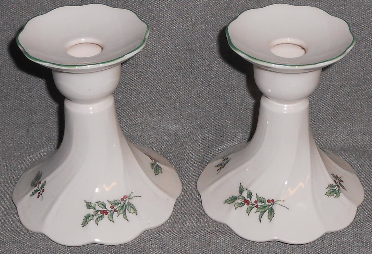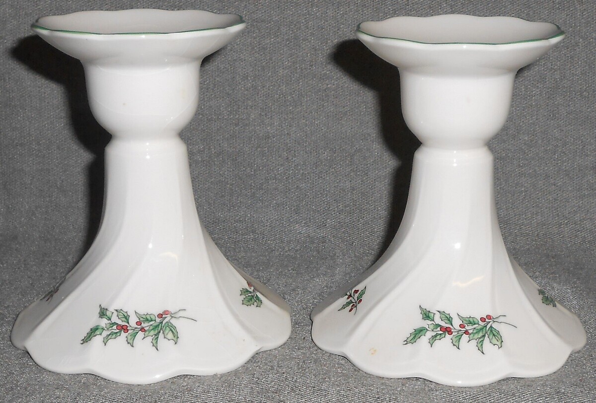 This is a Pair of Candlesticks that measure approx. 3 3/4" tall and approx. 3 1/2" wide at base from Nikko in the Happy Holidays Pattern. Both pieces are in great pre-owned condition with no chips or damage.