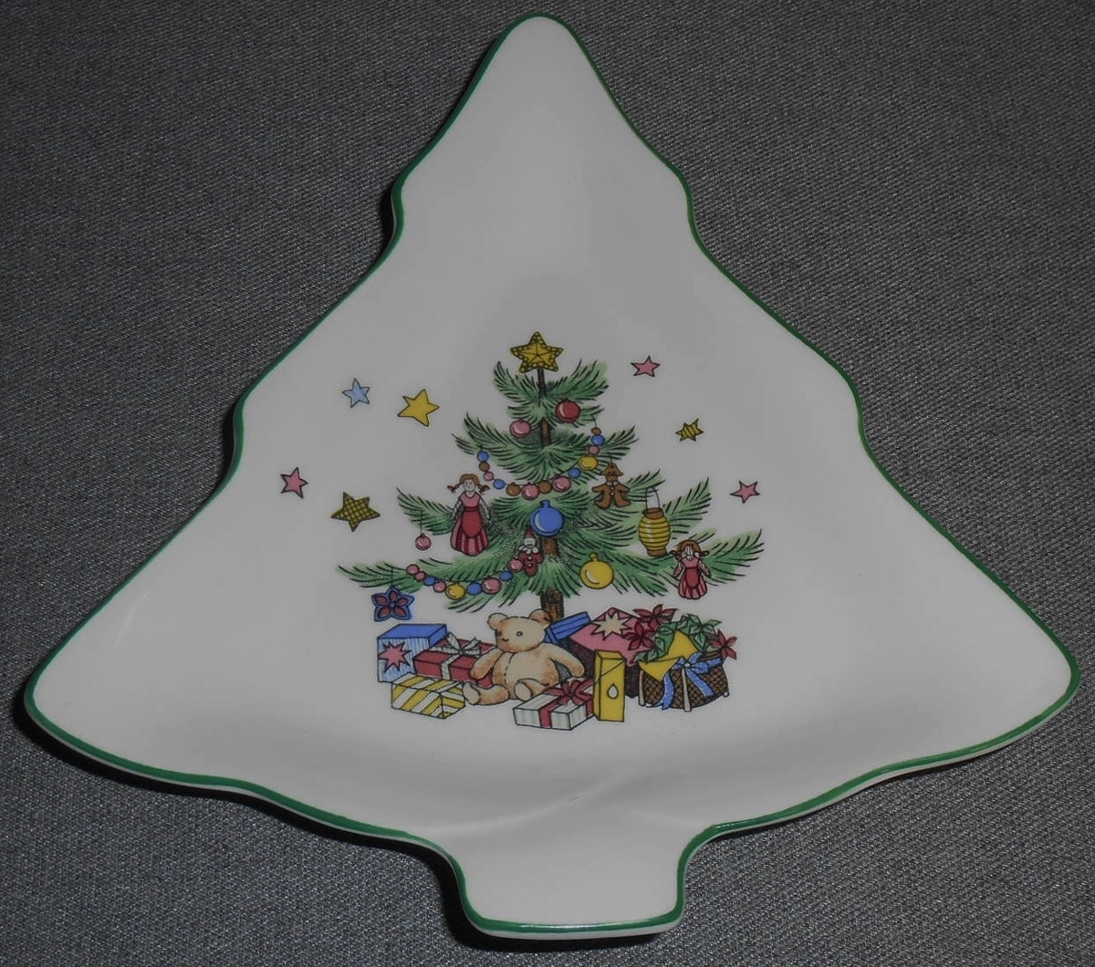 This is the 6 1/4" x 6 1/2" Christmas Tree Shaped Nut or Candy Dish from Nikko in the Happy Holidays Pattern. It is in great pre-owned condition with no chips or damage.