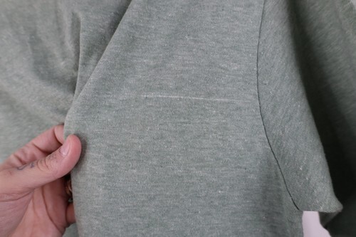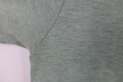 Blemishes front, right armpit, back. Collar, armpits discolored. Color faded. Pilling. Made in USA