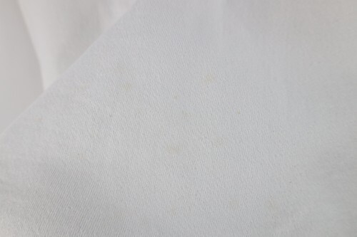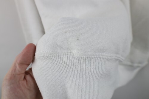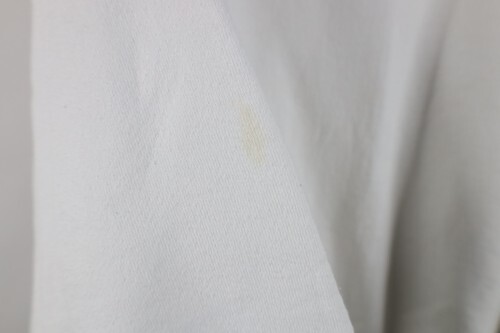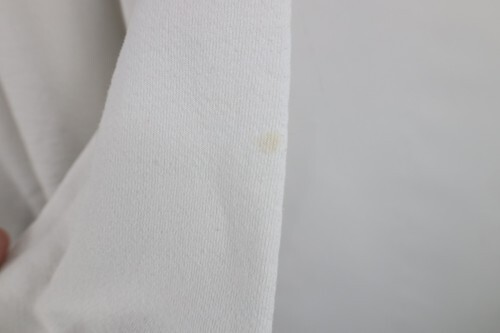 Blemishes/yellow spots front, arms/cuffs. Collar, cuffs discolored. Yellowed. Pilling