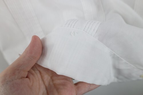 Hole/ripped front top right and pocket. Corners ripped. Blemishes pockets. Missing button back bottom. Collar, arms discolored. Yellowed. Pilling. Sheer fabric