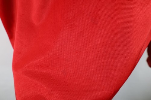Unstitched/loose threads collar. Stains/dark spots front, arms. Fabric pulls, pilling throughout. Collar, cuffs discolored. Color faded