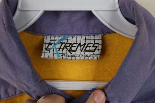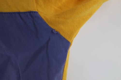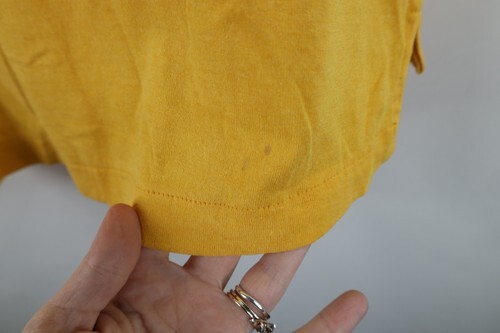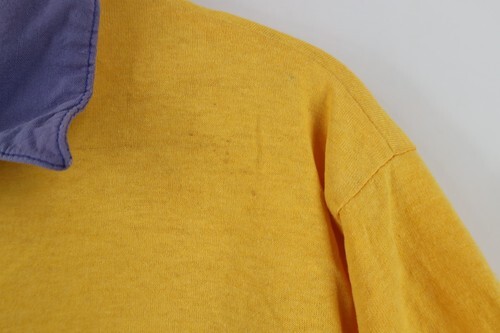 Hole left armpit. Bleach blemishes front. Stains throughout. Unstitched/loose threads collar, bottom hem. Collar, arms discolored. Collar tips distressed. Color faded. Pilling