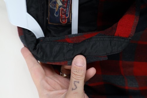 Missing button, loose threads buttons. Inner collar/cuffs discolored. Color faded. Pilling. Writing on tag