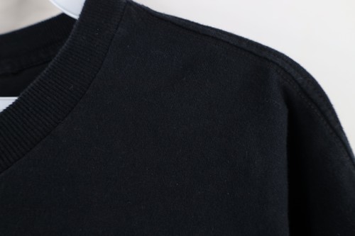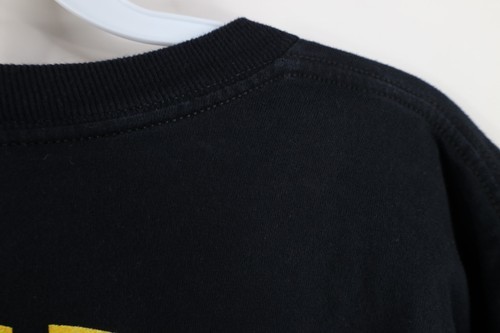 Unstitched/loose threads bottom hem. Bleach stains front. Blemishes shoulders, back top. Collar, arms discolored. Graphics, color faded. Pilling