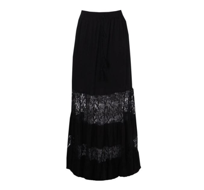Black maxi skirt with lace inset panels, elasticized drawstring waist. Partially lined. A-line silhouette.100% Viscose, Lace, 100% polyester lining. Perfect for stylish outings.