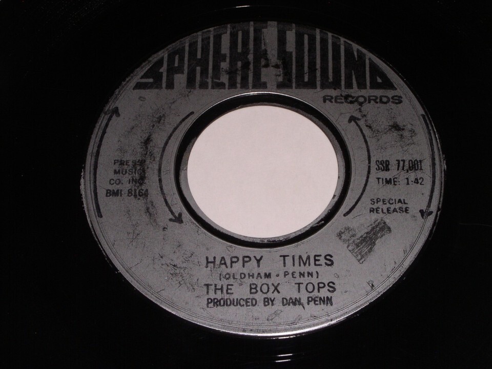 This is a vintage 45 rpm phonograph record by The Box Tops, entitled, "The Letter". Flipside: "Happy Times". Record label: Sphere Sound Sphere Sound 77,001.
