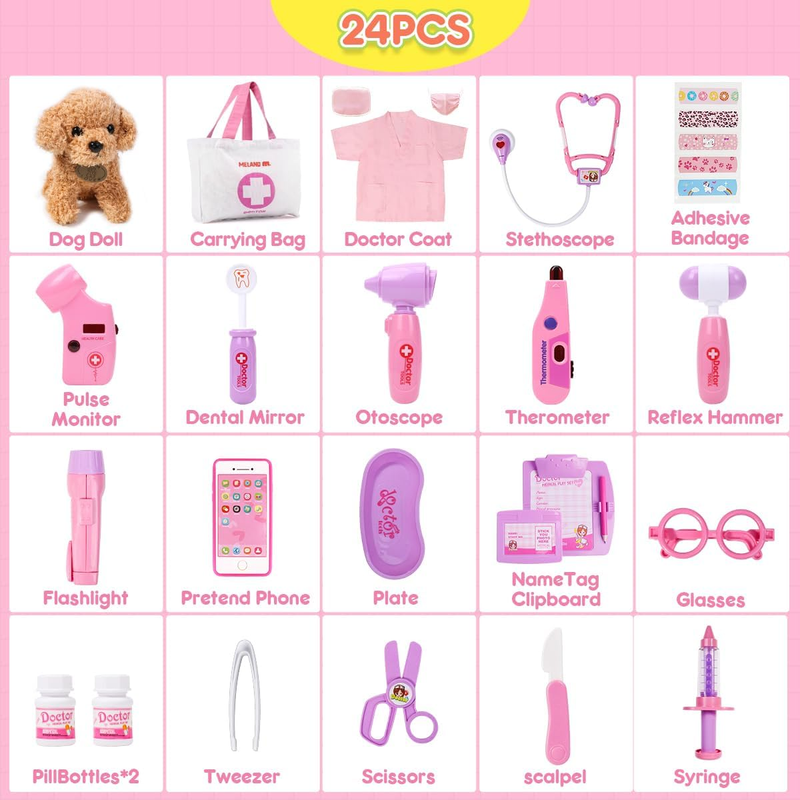 Doctor Kit for Girls with Pretend Play Vet Dog Toys. Meland Doctor Play Set comes with every imaginable tool that a future doctor will need, including a cute fluffy doy toy, doctor coat and hat,carrying bag,stethoscope toy, syringe, thermometer, tweezers, tray, dental mirror, doctor hammer, scissors, eyeglasses,otoscope and so on. This is such a wonderful starter surgeon kit for girls who like to pretend play and help those who dreams of being a doctor.