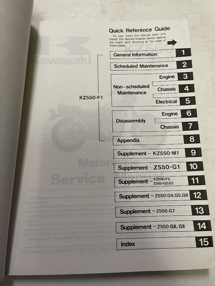 Pieno di informazioni e illustrazioni, copre tutto, istruzioni graduali, assemblaggio/smontaggio, illustrazioni/diagrammi esplosioni/risoluzione dei problemi, ottimo manuale da avere quando possiedi/manutenzione di un KZ550 e sara un grande aiuto per mantenere la tua bici sulla strada. Questo manuale ti fara risparmiare denaro in riparazioni/servizio. Un must ha se possiedi uno di questi veicoli.