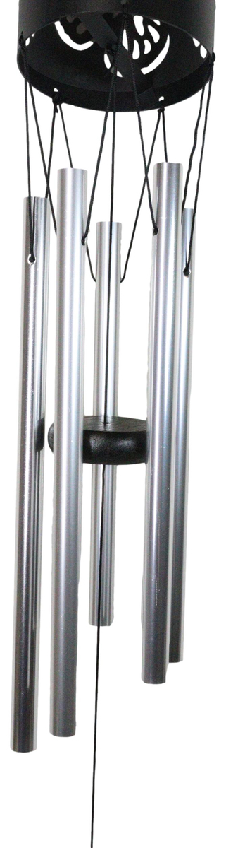 ? This Artistic Filigree Metal Solar Wind Chime is made of steel metal, powder coated in black.