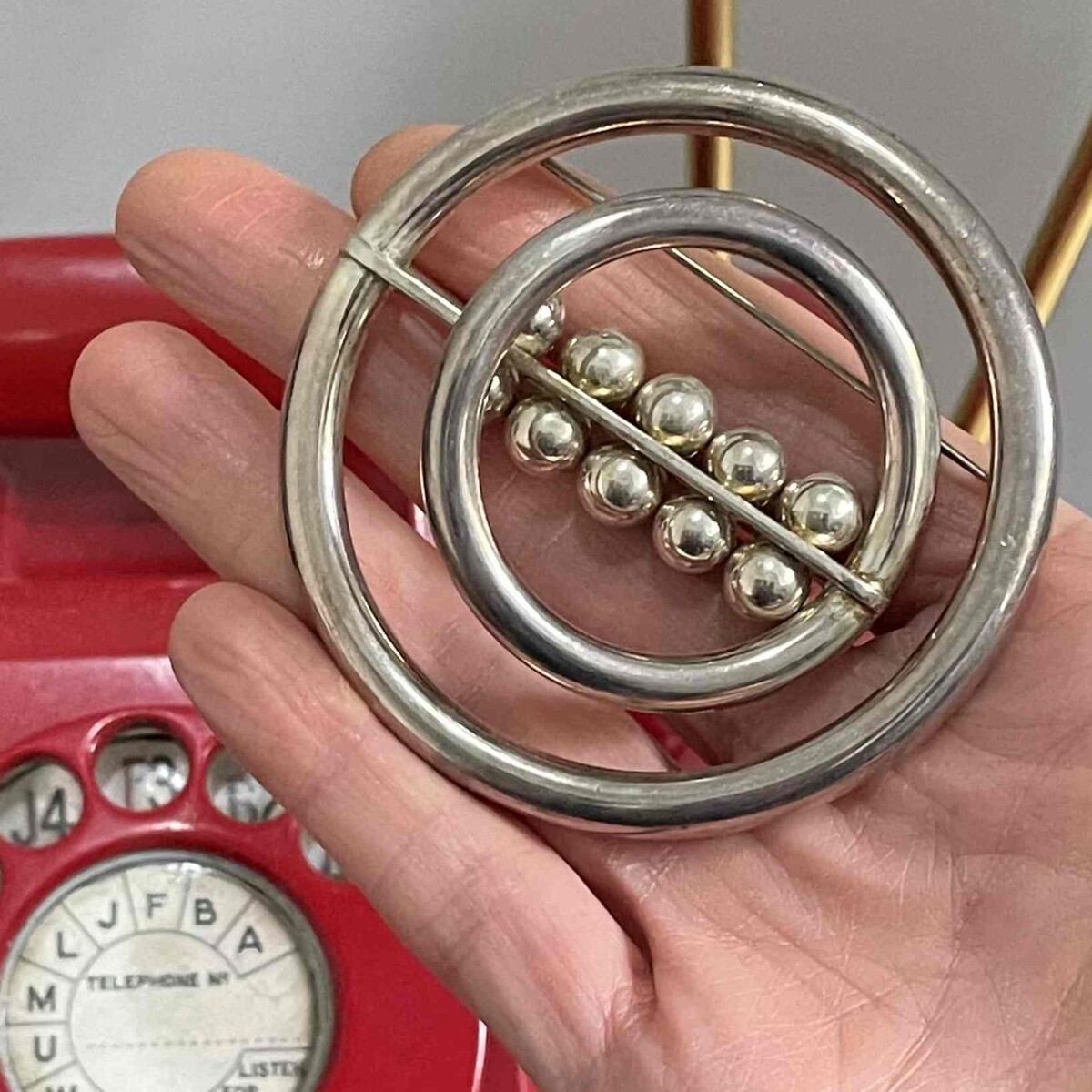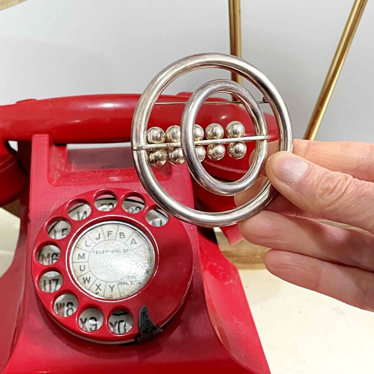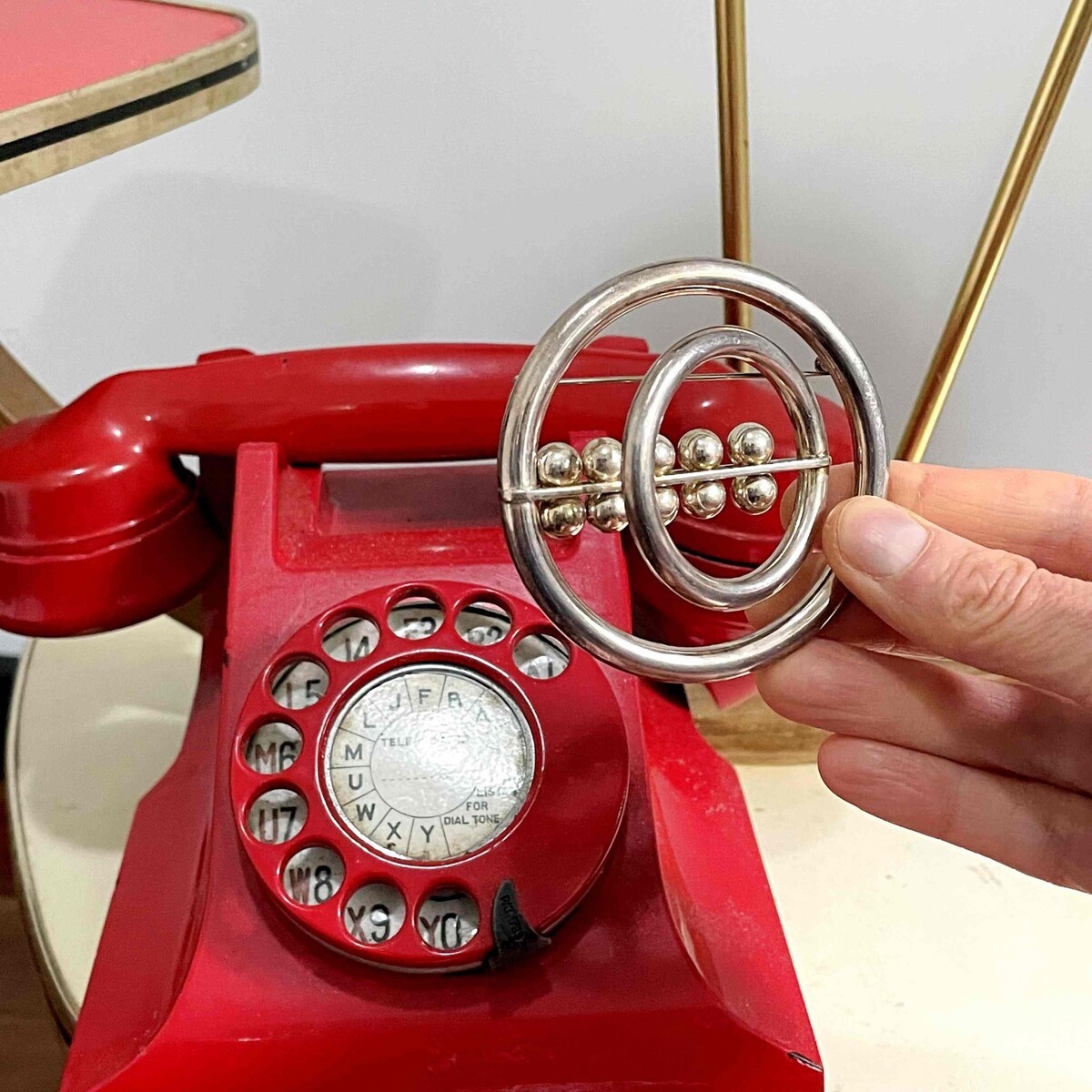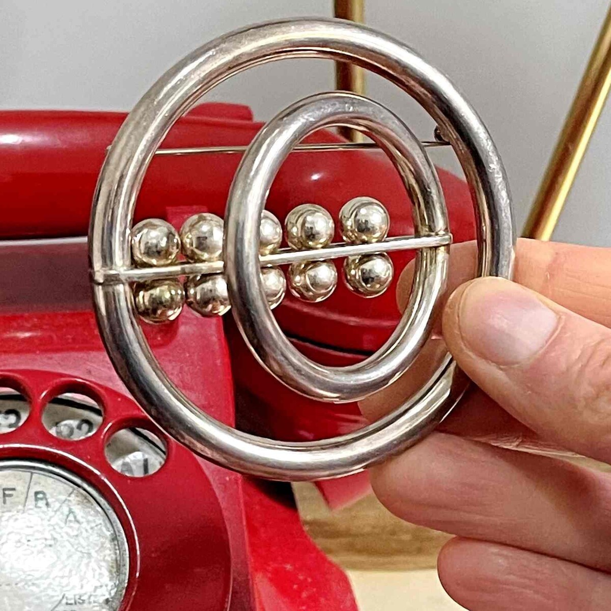 Pictures don't do justice to this one of a kind brooch/ pin from the very cool 80s. It is atomic in design and has a section of 10 moving fine sterling silver hand made balls as you can see in the photos. The brooch design incorporates the use of circles set at various angles alongside the moving spheres for the most wonderful unique and eye catching look you can imagine.