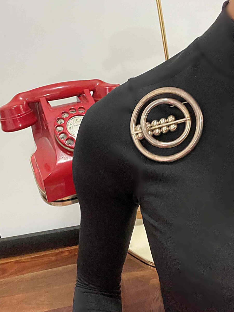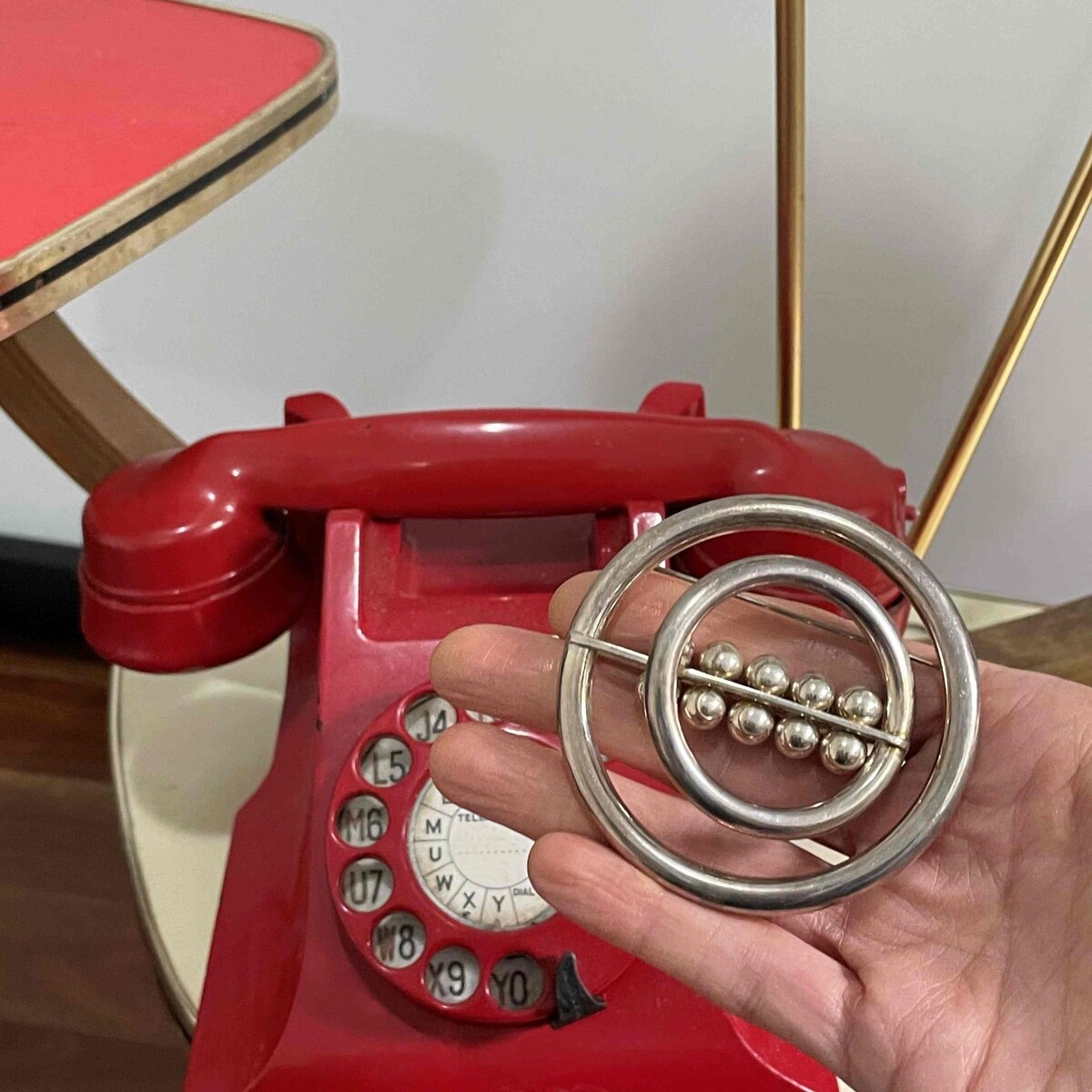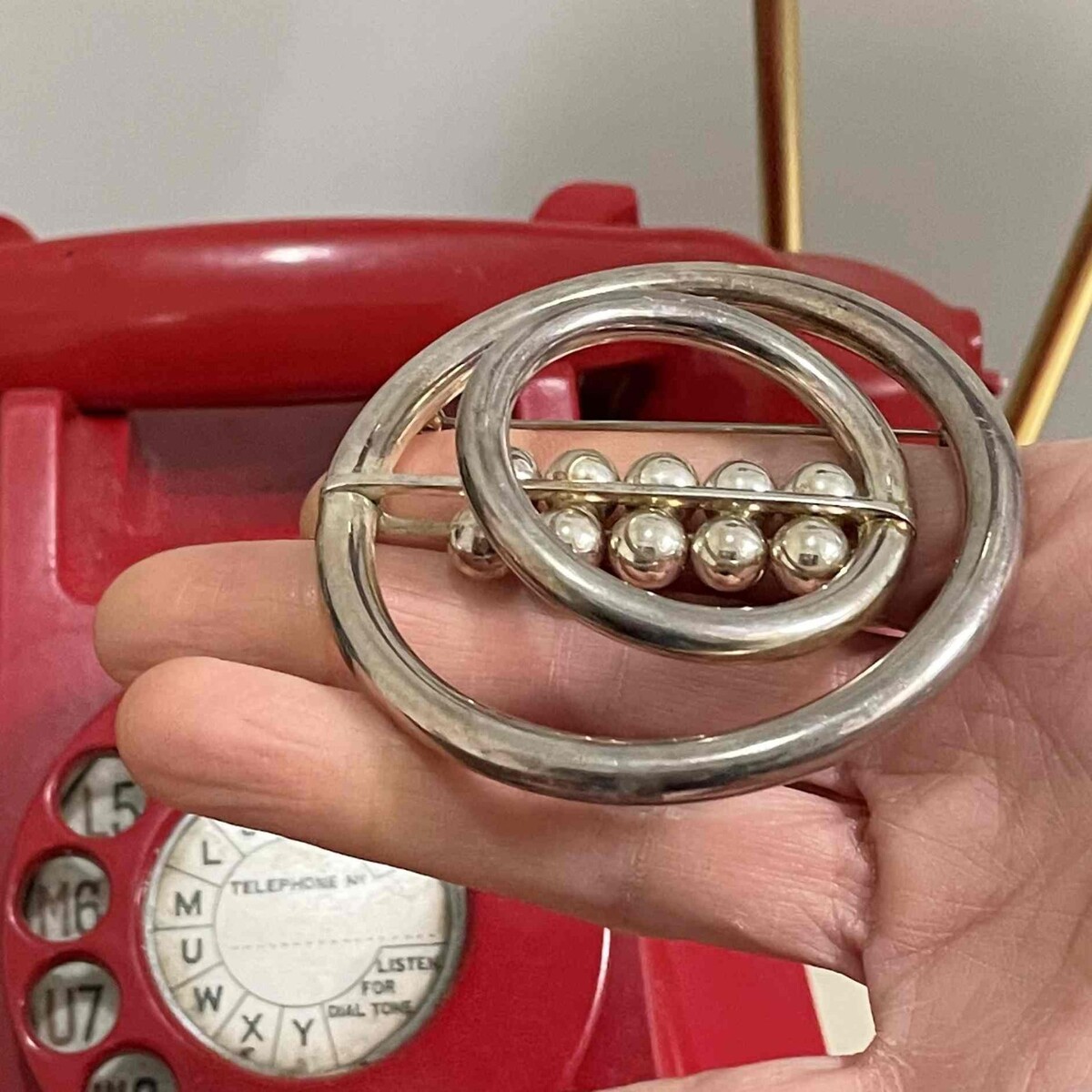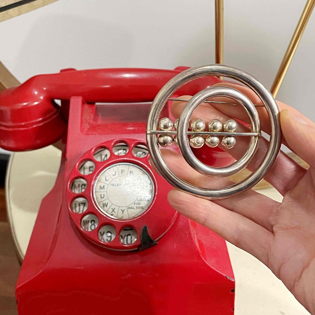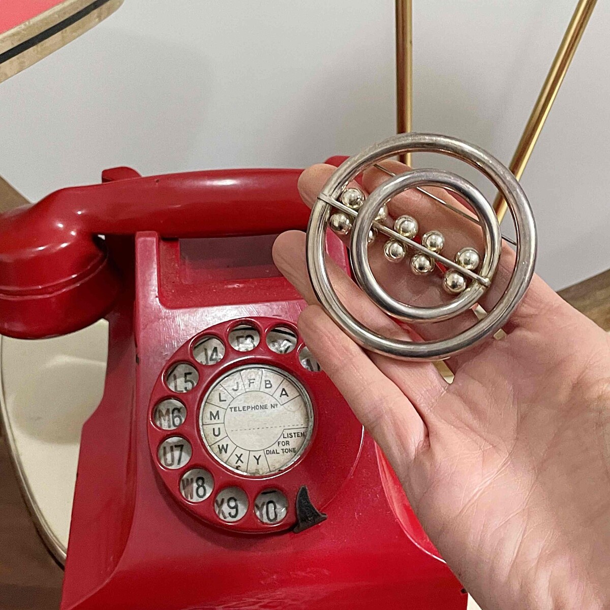 Pictures don't do justice to this one of a kind brooch/ pin from the very cool 80s. It is atomic in design and has a section of 10 moving fine sterling silver hand made balls as you can see in the photos. The brooch design incorporates the use of circles set at various angles alongside the moving spheres for the most wonderful unique and eye catching look you can imagine.