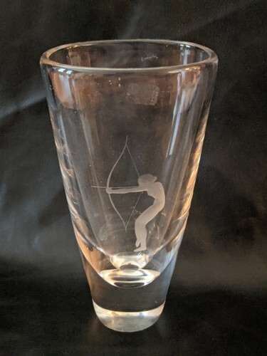 In vendita c'e un vaso alto in cristallo al piombo Orrefors Palmqvist arciere femminile da 9 pollici inciso in Svezia in perfette condizioni. Misurazioni: Altezza: 9 pollici Superiore: 4,5 pollici x 3 pollici In basso - 2.25 pollici x 2,25 pollici