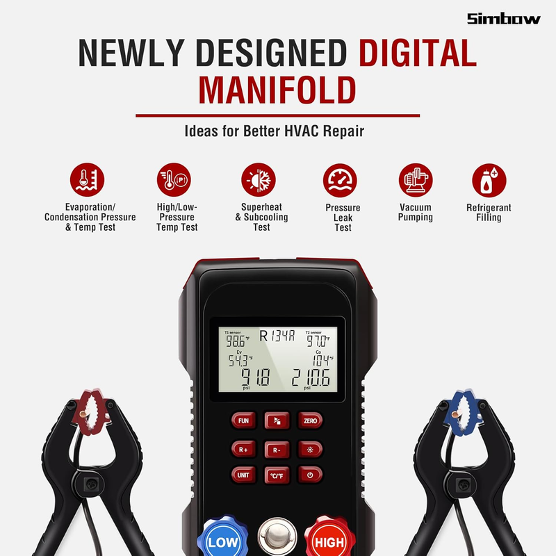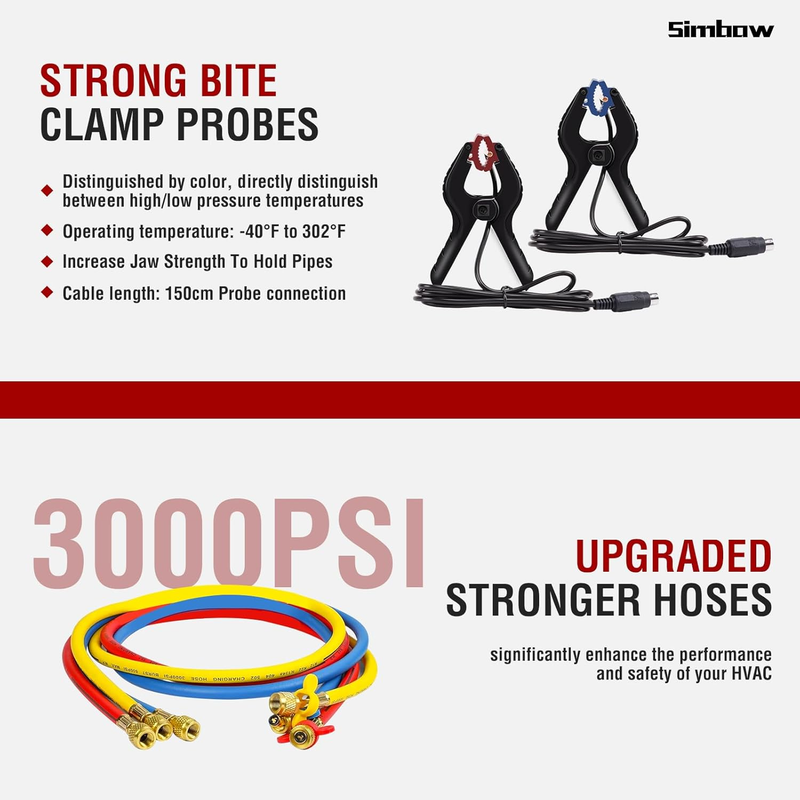 Digital Manifold Gauge, Digital AC Gauge Set SIMBOW AMF-300 HVAC Gauges with Strong Performance 3000 Psi Air Hose, Two Color Strong Biting Force Temperature Clamp for HVAC System Install Tool