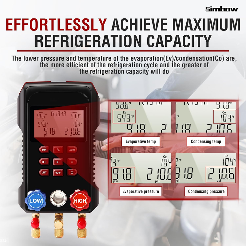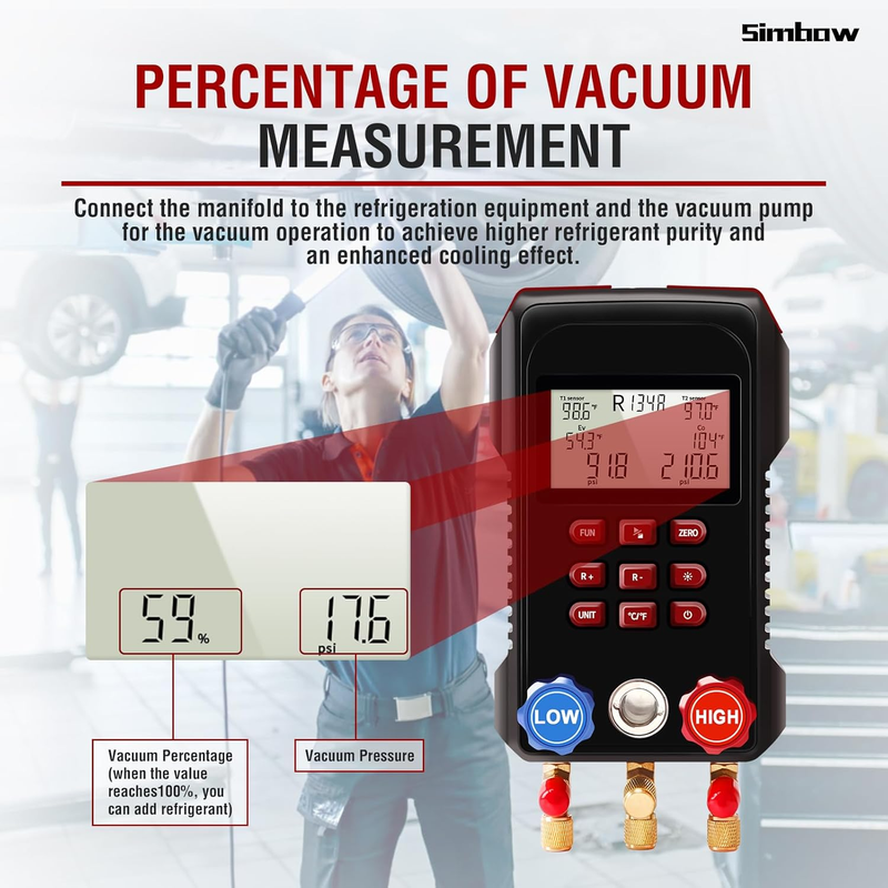 Advanced Functionality:The digital pressure gauge can measure double pressure at the same time, as well as dual temperature measurement, superheat and subcooling calculation. Also it tests percentage of vacuum measurement, pressure leak measurement, leak time speed record