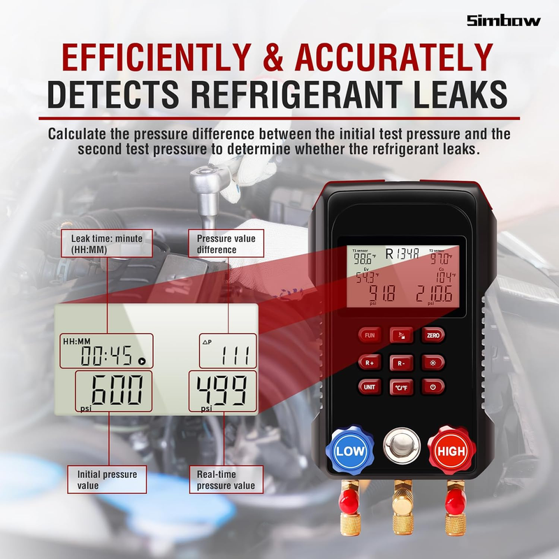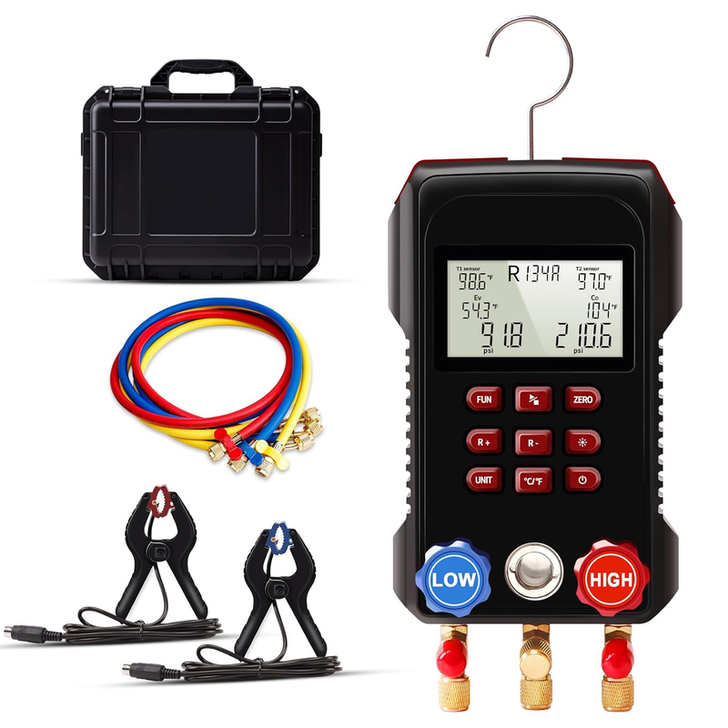 Smart Display Features: Features an LCD with backlight, supports multiple pressure unit conversions, and allows temperature readings in both Celsius and Fahrenheit. This makes it an essential tool for professional AC technicians and automotive mechanics.