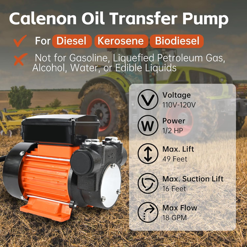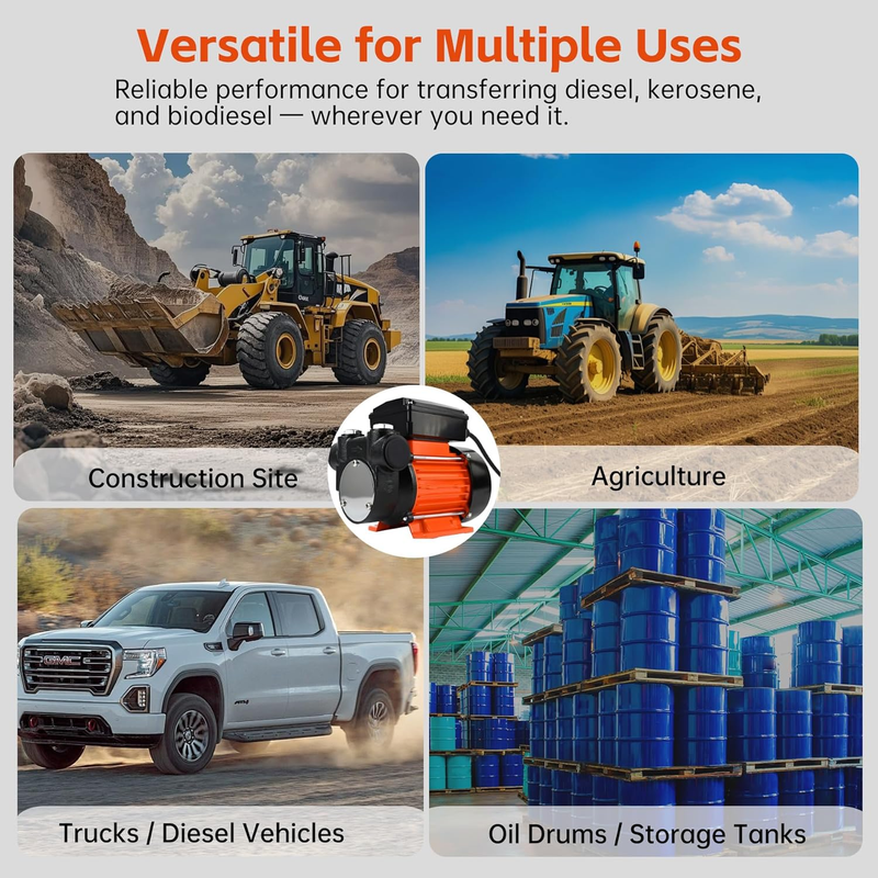 ?Multi-Fuel Compatibility? Designed for efficient transfer of diesel, kerosene, and biodiesel, this electric oil pump is ideal for tractors, excavators, generators, farm equipment, and oil tanks. ?? Not suitable for gasoline, alcohol, water, or other highly flammable or edible liquids.