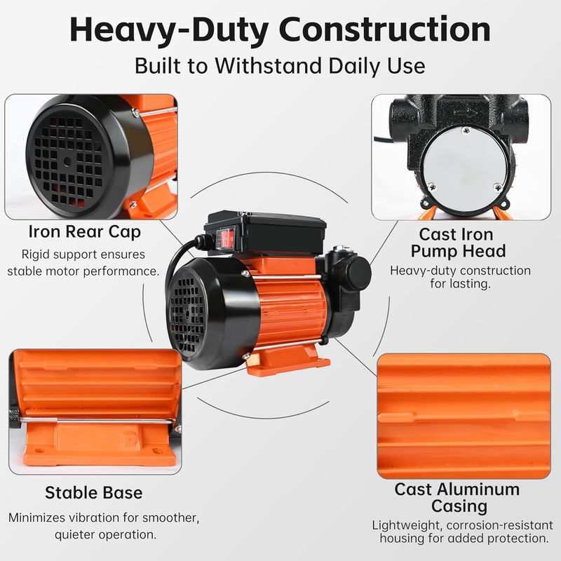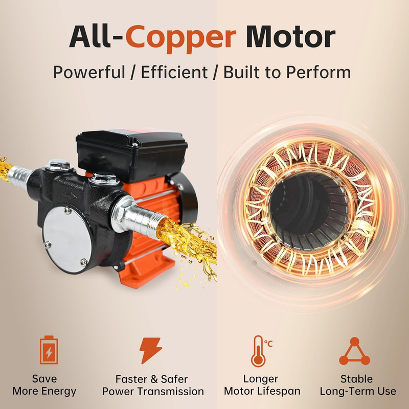 ?Durable Safe Construction?Built with a cast aluminum housing and an all-copper motor, this electric oil pump is resistant to corrosion and designed for efficient heat dissipation. It features a thermal protection system to prevent overheating and extend the motor?s lifespan, ensuring long-term and safe operation in workshops or outdoor environments.