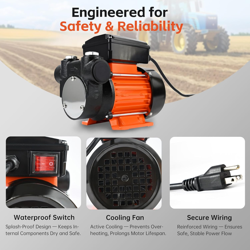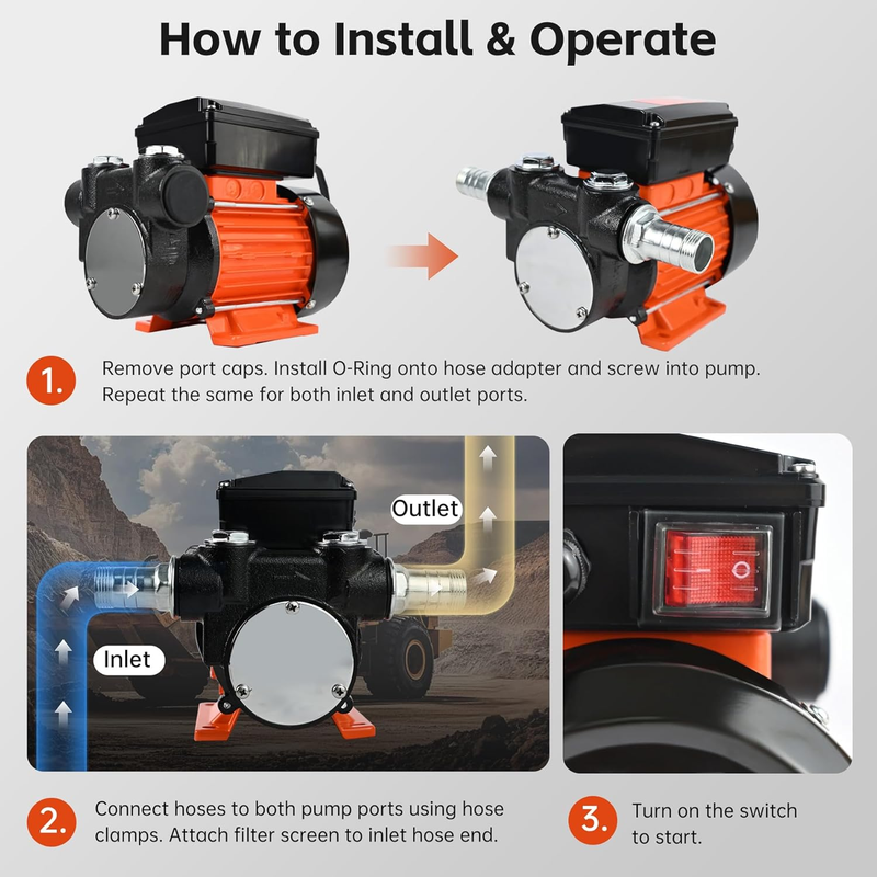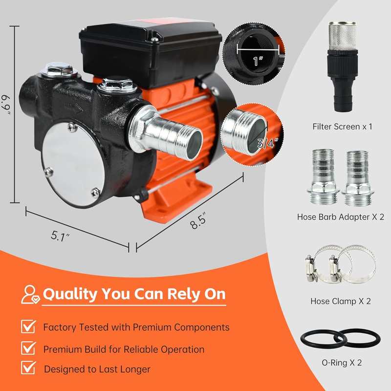 ?High Performance Efficiency?Equipped with a 110V AC motor delivering up to 18GPM flow rate (1/2 HP), this diesel transfer pump provides fast and stable fuel transfer for trucks, machinery, and farm equipment. Featuring a 49ft lift height and 3/4? hose adapters, this self-priming design ensures efficient operation and reliable suction for daily refueling tasks.