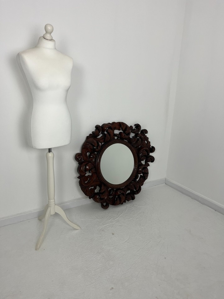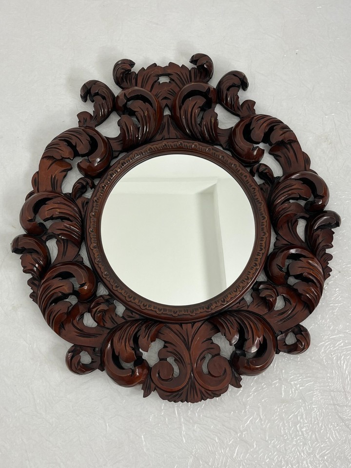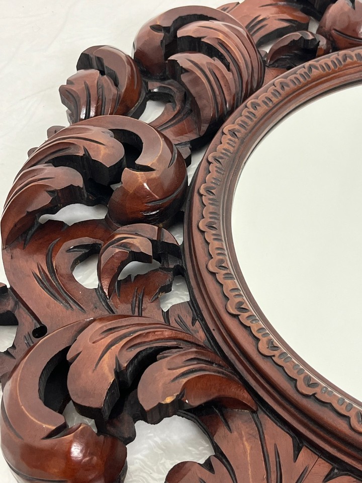 Grande specchio da parete in legno di noce intarsiato, Made in Italy, anni '60