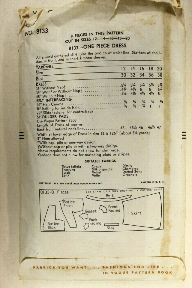 Vtg 1953 Sewing Pattern Vogue #8133 Huge and 44 similar items