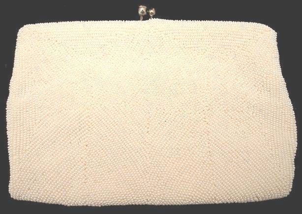 Richere vintage white beaded clutch purse is 5 oe? high x 7 oe? wide and features an ivory silk lining and silver-tone ball closure with rhinestone accents. Excellent condition, not a spot or stain...simply elegant! It would be perfect for a bride.