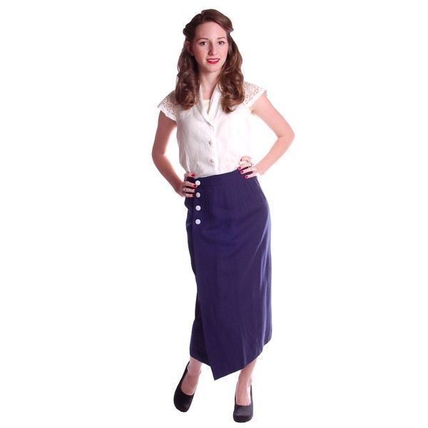 Charming vintage navy blue linen wrap pencil skirt with classic midcentury tailoring and unique details you only find in true vintage. Features a wrap-style front secured by 4 mother-of-pearl-style buttons, and a surprise interior of polished cotton lining in blue-and-white polka dots. From Rattet Sons, Boston, with its original hang tag stating ?Linen ? Unconditionally Guaranteed!?