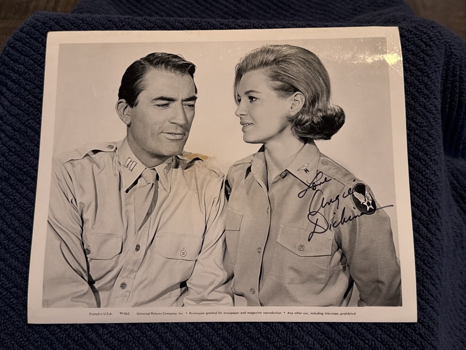 8 x 10 original studio photograph of Gregory Peck and Angie Dickinson from Captain Newman MD. Signed by Angie Dickinson.