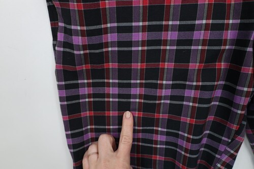 Fabric pulls, blemishes front right leg. Color faded. Pilling