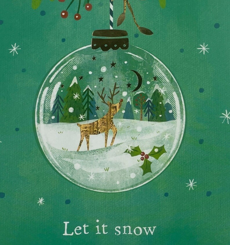 Features a glass ornament with a red-nosed reindeer in a snowy forest and the words Let It Snow on the front.