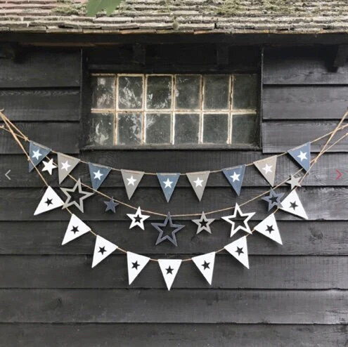 East of India, gorgeous hanging flag wooden bunting, features 9 individual Blue, Grey White flags hanging from a hessian rope with loops either end
