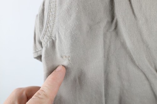 Blemish and hole front middle and left sleeve. Patched hole on back. Writing on tag.