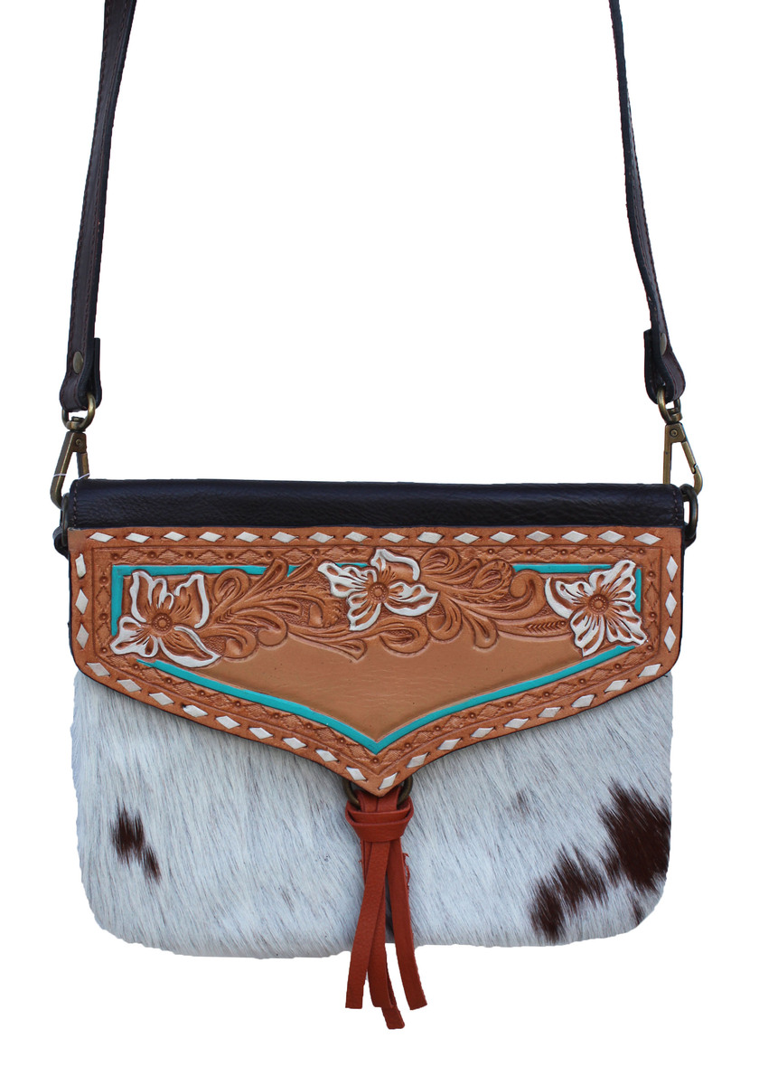Challenger hair-on hide women's shoulder bag. Features floral-tooled leather accents. Fully lined inside with an additional, side zippered pocket. Bag measures 10" long x 7 1/2" tall, providing plenty of room for all essentials.