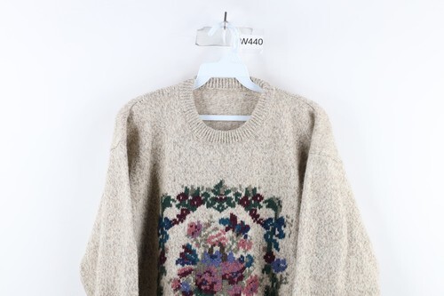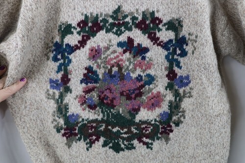 Vtg 90s Country Primitive Womens Medium Wool Knit Flower Floral Crewneck Sweater