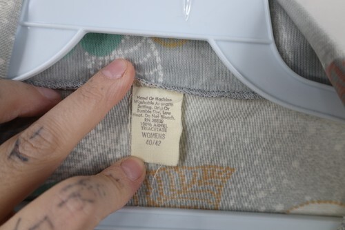 Mended Hole right armpit. PIn hole back top. Collar, arms discolored. Discolored bottom hem. Color faded. Pilling. USA made