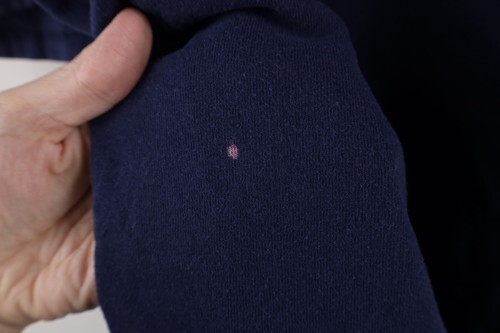 Hole front bottom, left armpit. Bleach spot on the back. Color fade. Graphics distressed. Pilled