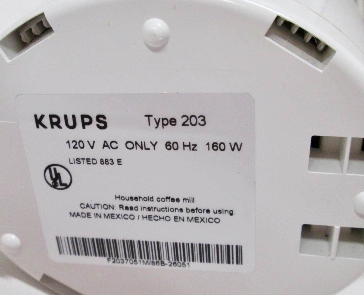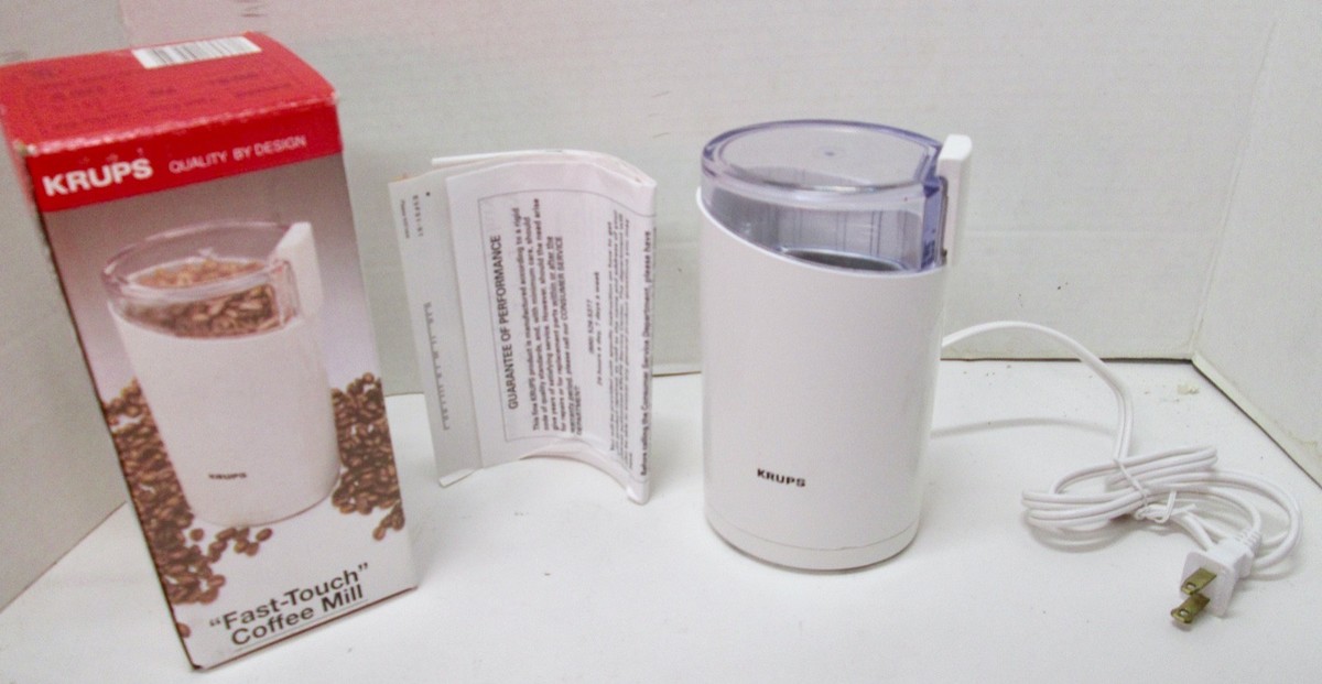 Elevate your coffee experience with this vintage KRUPS "Fast Touch" Coffee Bean Mill Grinder, Type 203, a sleek white addition to your kitchen.