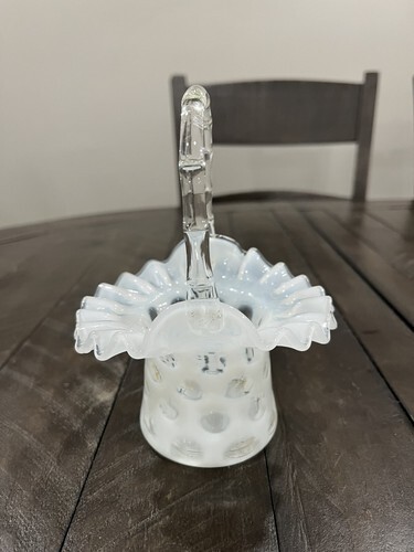 Fenton Opalescent Coin Dot Basket with Clear Handle White No Chips/cracks