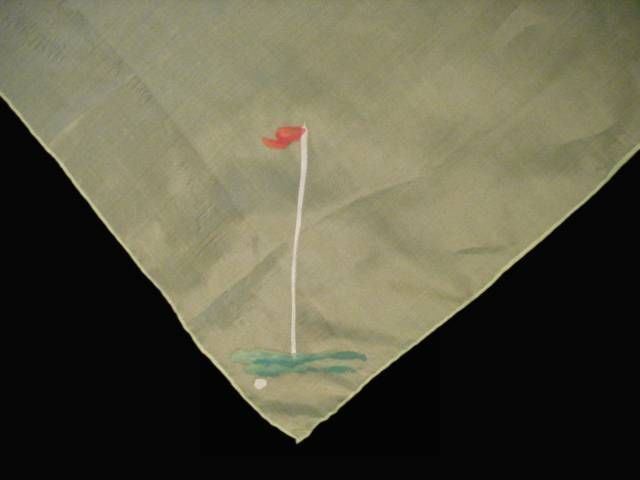 31? x 31? pale lime green silk scarf with a hand-rolled hem featuring a hand-painted golf theme in one corner. There are a few very small "stretch marks?, but it is otherwise in excellent condition.