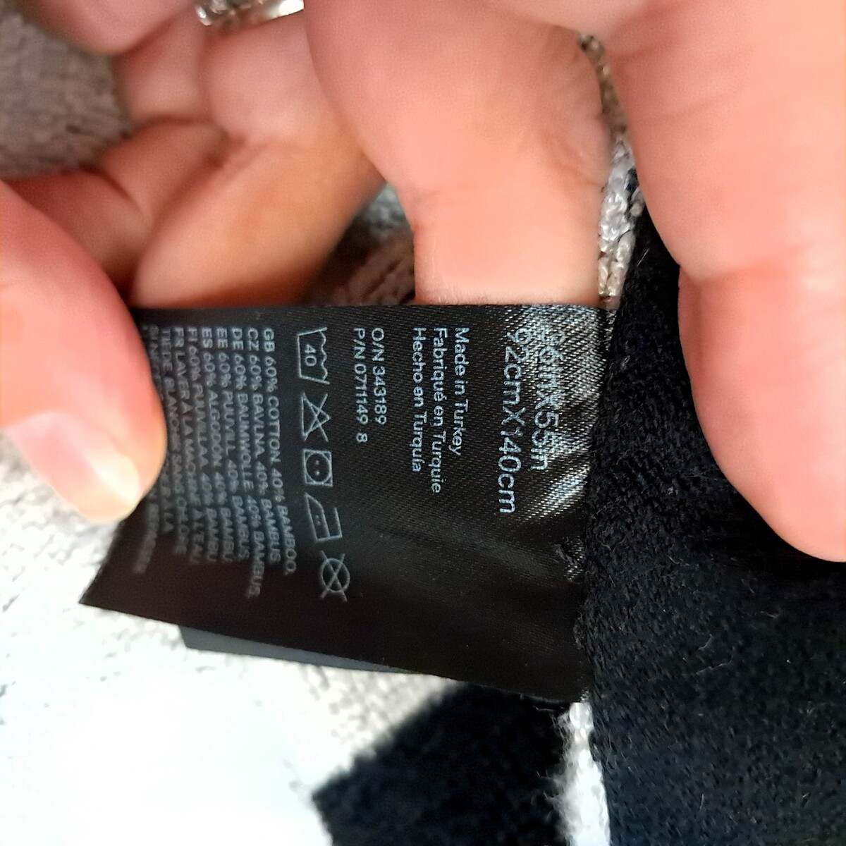 Black and white towel. Some thread pulls and slightly shrunken around the edges from washing as shown. See pics.
