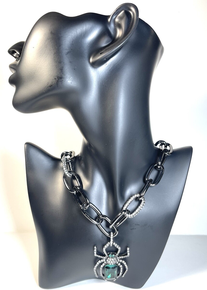 NEW $85 BETSEY JOHNSON Gunmetal Black Green Spider Rhinestone Necklace 452837
