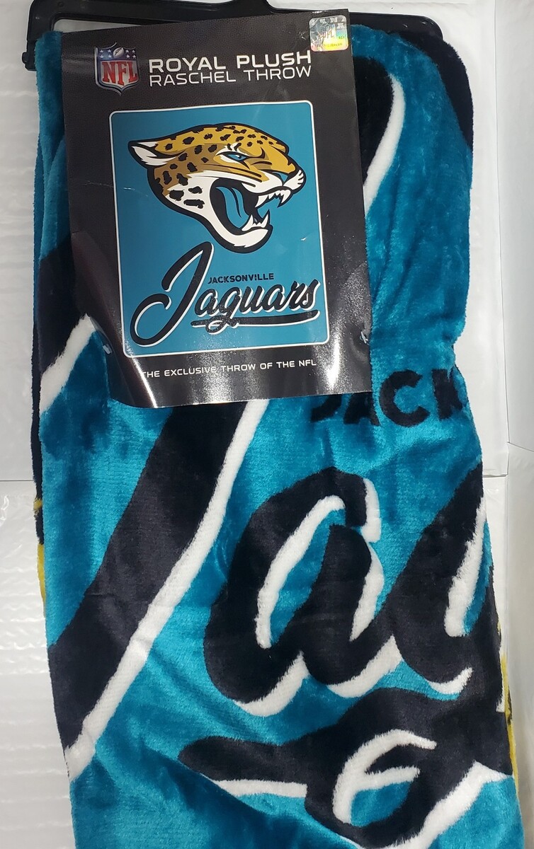 This is a 50" by 60" plush Jacksonville Jaguars raschel throw blanket.