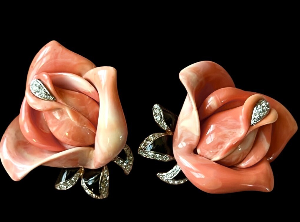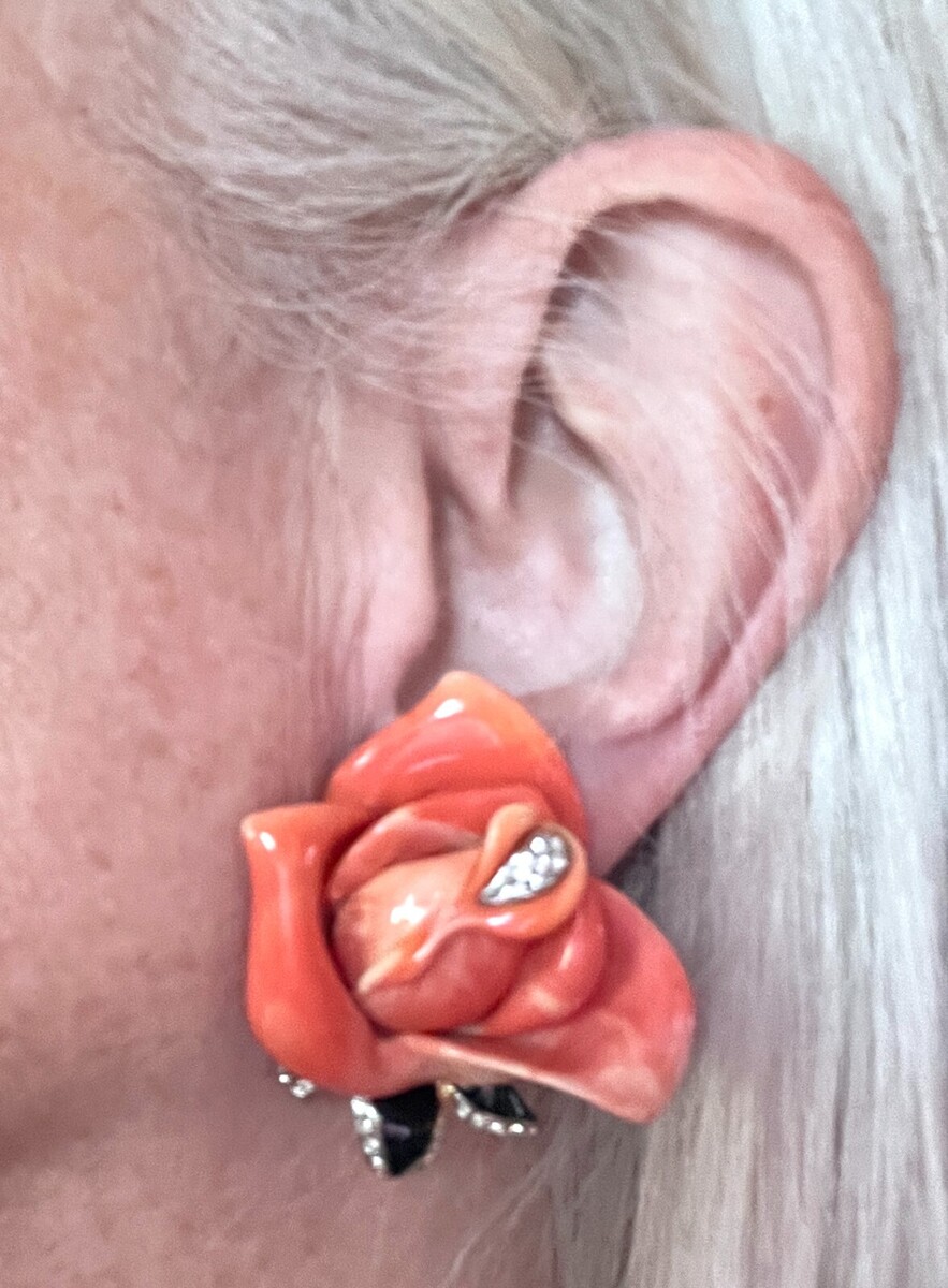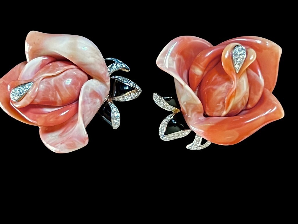 Beautiful pair of vintage enamel faux coral clip earrings by designer Kenneth Jay Lane. Roses made from orange-pink lucite are accented with black enamel and clear rhinestones in gold plated settings. The earrings are each about 1.25" x 1", with secure, padded clip backs. Stamped KJL on the backs. Absolutely mint, seem never worn.