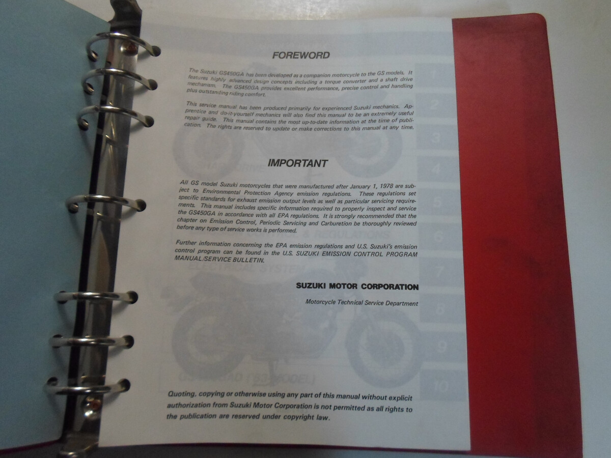 Informative with illustrations, covers a lot, exploded illustrations and/or diagrams, great manual to have when you own a SUZUKI GS450GA and it will keep your motorcycle on the road. This manual will save you money in Repairs/Service.